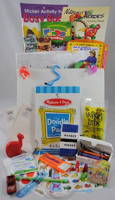 Next on the list is the perfect bag for a shorter trip or perfect to keep in the car when running errands! The mid-sized kit ($18) is packaged in a lunch bag with a mesh side pocket perfect for storing a sippy cup or a bottle of water along with a small assortment of activities (small toys too!) plus the much needed wipes, tissues and bandages.